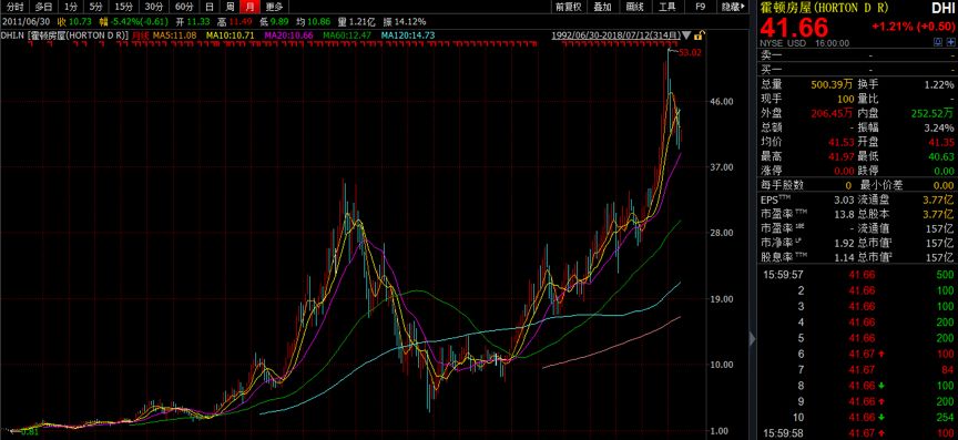 霍頓房屋于1992年登陸紐交所,隨后開始不斷擴大業(yè)務(wù)規(guī)模。目前,霍頓在美國26個州的79個市場開展業(yè)務(wù)。從2002年開始,連續(xù)16年為全美銷量第一的開發(fā)商。感受下霍頓房屋的股價走勢: