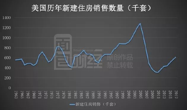 可以說,二戰(zhàn)后直至1970年代初,美國房地產(chǎn)行業(yè)的繁榮本質(zhì)上是由城市化進程推動的。來看一下美國歷年新建住房銷售數(shù)量的情況: