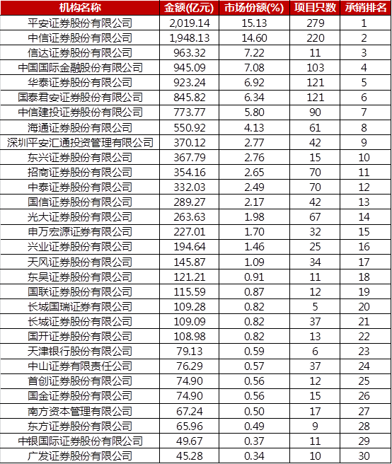 2021年,證監會主管ABS承銷排名靠前的機構分別為平安證券、中信證券、信達證券、中金公司、華泰證券和國泰君安,承銷金額分別為2,019.14億元、1,948.13億元、963.32億元、945.09億元、923.24億元和845.82億元。前五大、前十大和前二十大承銷商市場份額占比分別為50.94%、72.73%和88.86%。