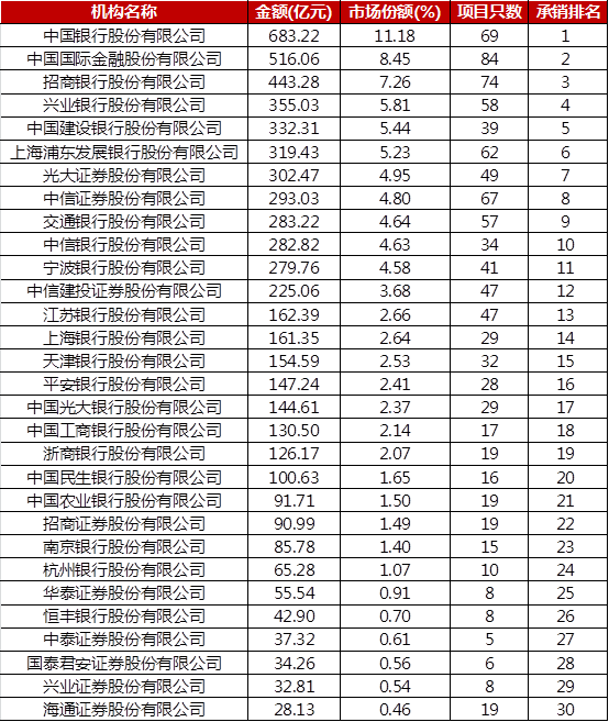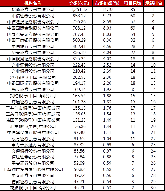 2021年,交易商協會ABN承銷排名靠前的機構分別為中國銀行、中金公司、招商銀行、興業銀行、建設銀行和浦發銀行,承銷金額分別為683.22億元、516.06億元、443.28億元、355.03億元、332.31億元和319.43億元。前五大、前十大和前二十大承銷商市場份額占比分別為38.14%、62.38%和89.10%。