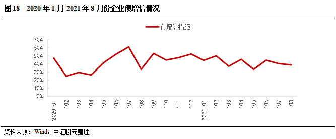 2021年8月,企業債有擔保的債券共計19只,數量占比39%,較上月下降1個百分點。分主體級別看,AA級主體選擇保證方式增信發行的債券比重為81.3%,較上月下降5.4個百分點;AA+級主體選擇增信發行的債券比重為15.8%,較上月下降15.5個百分點。綜合2021年1-8月看,有增信的債券占比43%,與上年持平。從趨勢看,2021年6月以來有增信債券占比呈現下降。