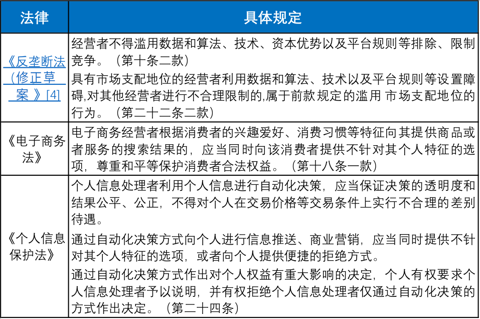 在法律法規(guī)層面,除《反壟斷法》相關(guān)規(guī)定外,《電子商務(wù)法》、《個(gè)人信息保護(hù)法》等多部法規(guī)都對(duì)算法規(guī)制作出規(guī)定,具體如下表所示: