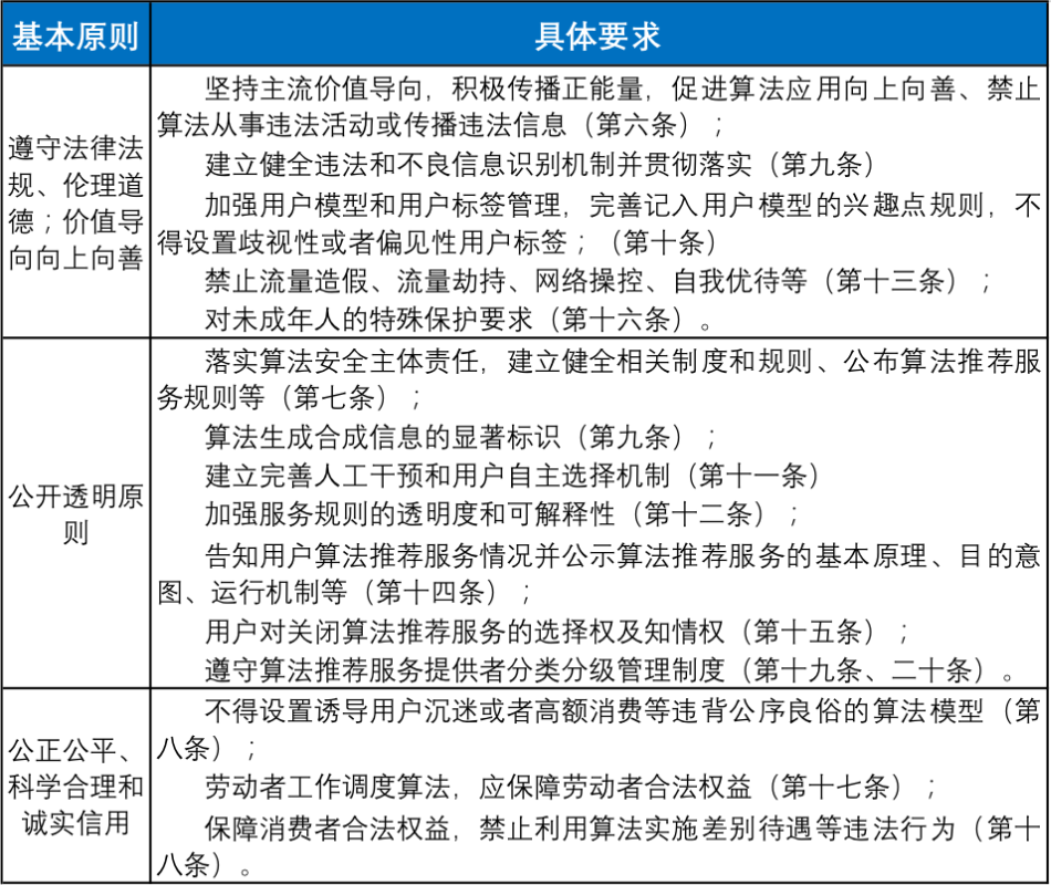 對(duì)于算法合規(guī)的原則和方法,國(guó)家網(wǎng)信辦于今年8月27日發(fā)布了《互聯(lián)網(wǎng)信息服務(wù)算法推薦管理規(guī)定(征求意見(jiàn)稿)》,對(duì)應(yīng)用算法推薦技術(shù)[5]提供互聯(lián)網(wǎng)信息服務(wù)的基本原則、基本管理制度作了較為全面而系統(tǒng)的規(guī)定。這也可以作為企業(yè)建立算法合規(guī)的一個(gè)重要參考,現(xiàn)將其主要內(nèi)容整理如下: