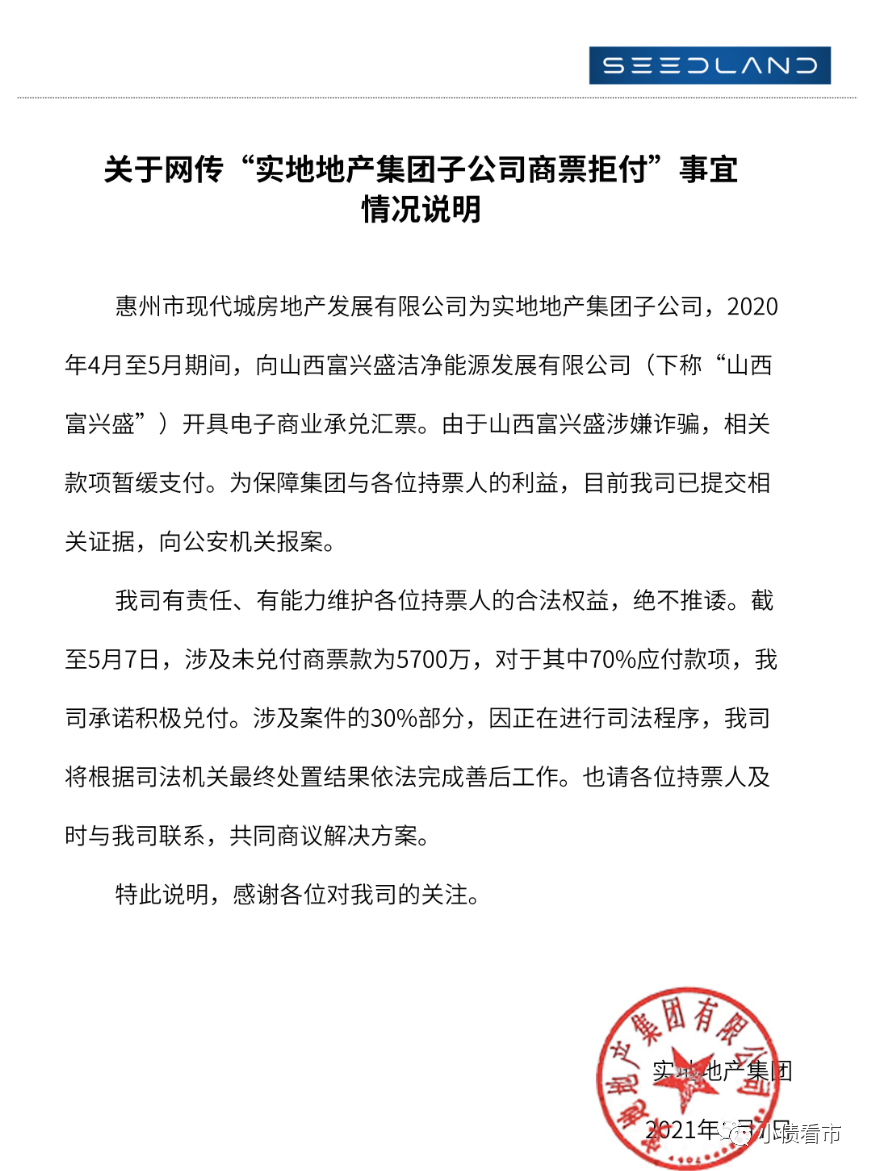5月8日,實地地產再次聲明稱,截至當日所涉及到期的5700萬元商業承兌匯票,已100%承兌。