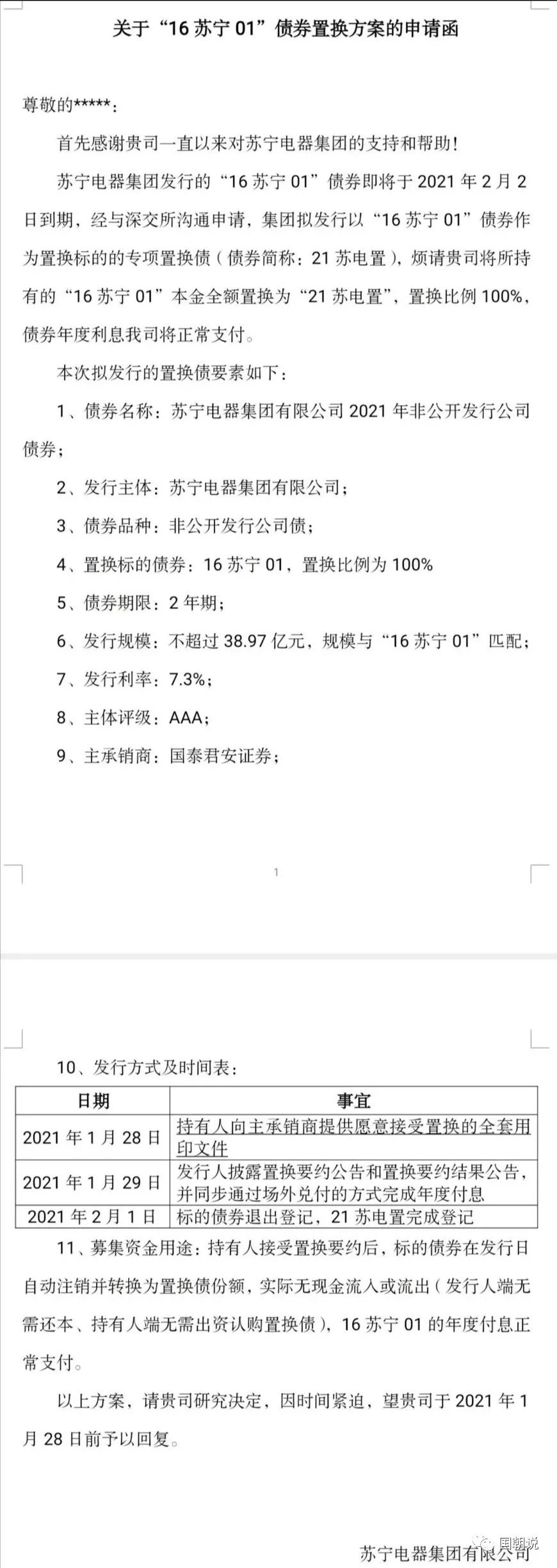1月26日晚,一份《關(guān)于“16蘇寧01”債券置換方案的申請函》在各大群迅速傳播,引起廣泛關(guān)注,蘇寧在本月初提前兌付了100億債券后,似乎有點(diǎn)撐不住了。
