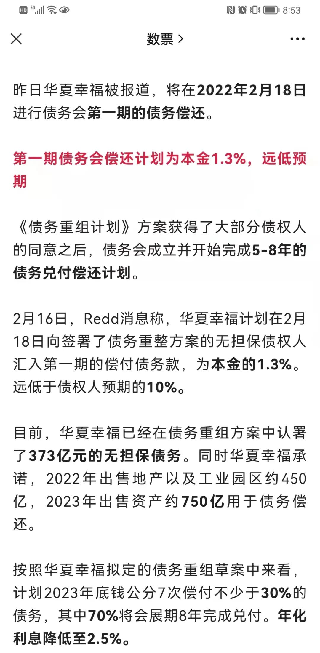 據(jù)悉,華夏幸福與中融信托就逾期信托計劃產(chǎn)品,談的是5年的一個計劃還款方案,最后將其改為8年時間。