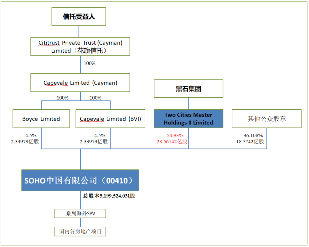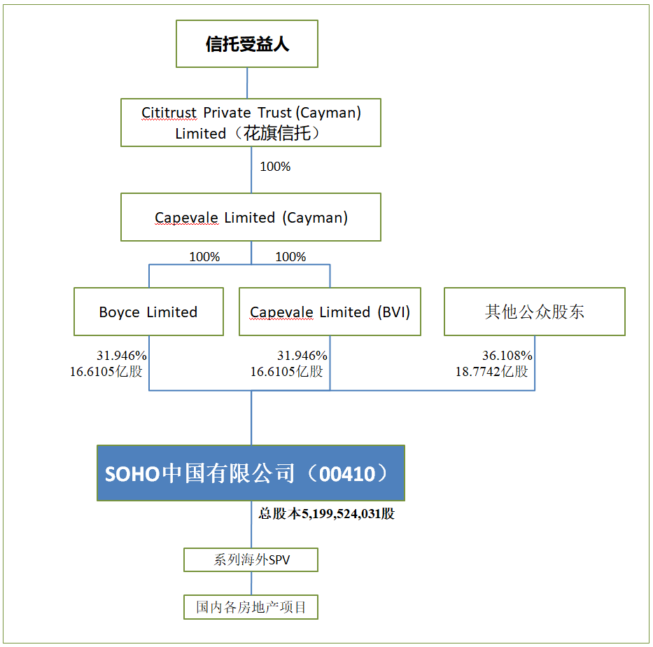 • 而Boyce Limited 和Capevale Limited (BVI)則分別持有港交所上市公司SOHO中國16.6105億股(31.946%)的股份,兩者合計33.221億股,占上市公司63.892%股份;