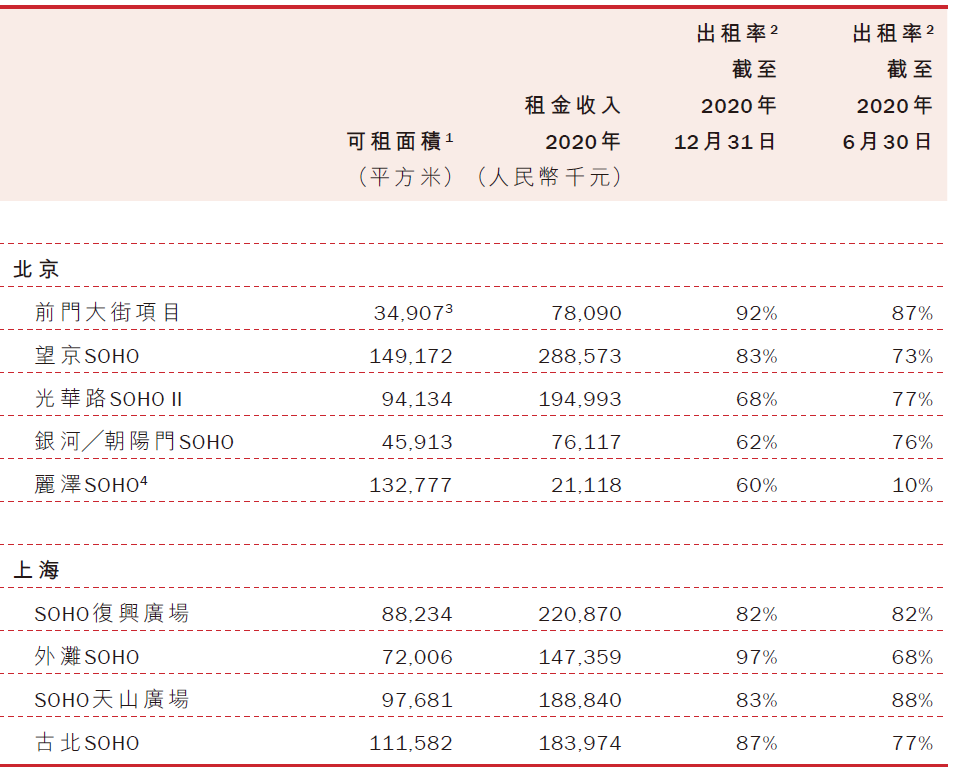 8個收租物業中,4個位于北京,分別為望京SOHO、光華路SOHO II、麗澤SOHO以及前門大街項目;4個位于上市,分別為SOHO復興廣場、外灘SOHO、SOHO天山廣場、古北SOHO。上述8個項目加上銀河SOHO及朝陽SOHO的尾房,總可租賃面積約86.6460萬平米。
