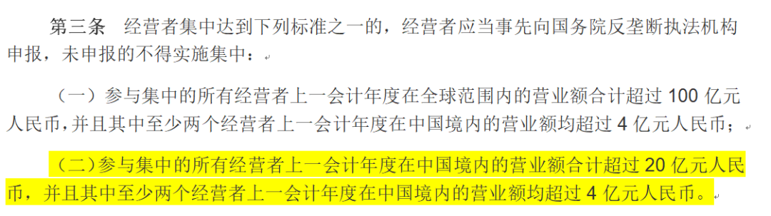 根據2008年8月3日國務院頒布的《國務院關于經營者集中申報標準的規定》第三條的規定: