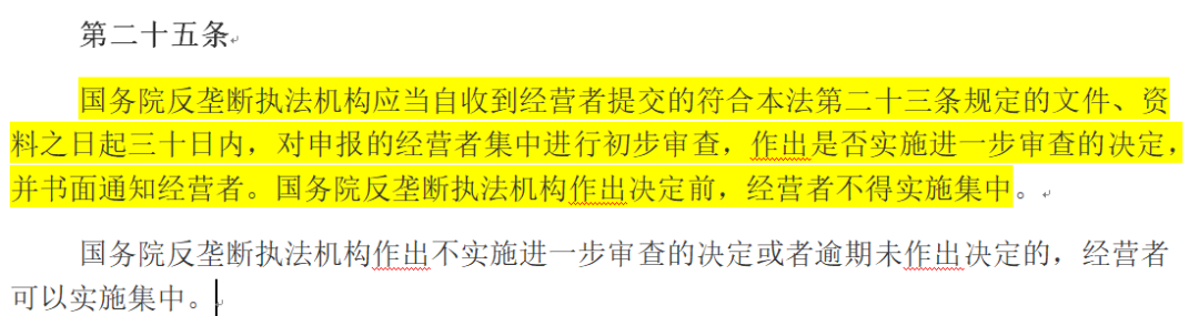 根據《中華人民共和國反壟斷法》第二十五條的規定,市場監管總局應在收到經營者集中申報文件后三十日內進行初步審查,并作出是否實施進一步審查的決定。在此之前,經營者不得實施集中。