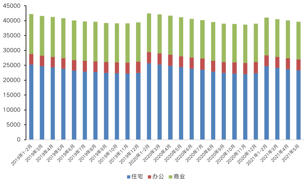 具體而言,得益于市場成交火熱,供不應(yīng)求帶動整體庫存回落,住宅待售面積降幅顯著,較4月減少399萬平方米,辦公、商業(yè)待售面積降幅有限,5月較4月下降均不超20萬平方米,整體去化壓力依舊較大。