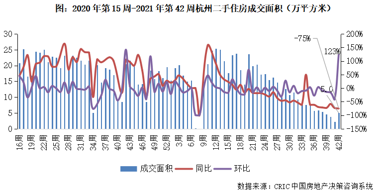 2021年第42周,杭州二手住房環比漲123%,同比下降75%,成交規模收5.0萬平方米。自4月高位以來杭州市場規模持續震蕩下行,政策調控下市場規模持續降級,本周規模低位回升但仍處底部,后續規模或持續震蕩。