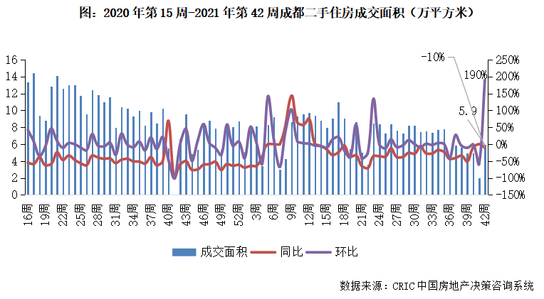2021年第42周,成都二手住房成交面積環比增長190%至5.9萬平方米。年后成都市場長期表現平穩,近期因二手房參考價機制逐步落地成交規模降級,本周成交回歸常態,規模仍在當前規模震蕩,后續市場或延續震蕩走勢。