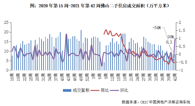 2021年第42周,佛山二手住房成交面積環比增長98%,成交體量收8.3萬平方米,同比回落54%。佛山市場受廣深莞等調控影響市場同步下行,本周市場低位回升,整體來看仍處于下行通道,短期內成交體量或小幅震蕩。