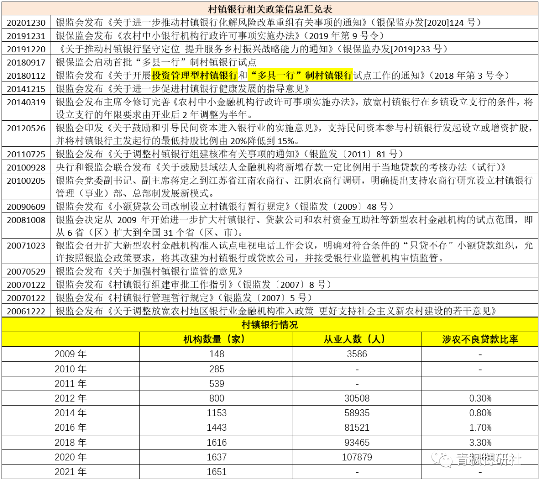 1、2005年與2006年,中共中央、國務院先后印發(fā)《關(guān)于進一步加強農(nóng)村工作提高農(nóng)業(yè)綜合生產(chǎn)能力若干政策的意見》(中發(fā)〔2005〕1號)和《關(guān)于推進社會主義新建設(shè)的若干意見》(中發(fā)〔2006〕1號),提出鼓勵在縣域內(nèi)設(shè)立多種所有制的社區(qū)金融機構(gòu)……有效解決農(nóng)村地區(qū)銀行業(yè)金融機構(gòu)網(wǎng)點覆蓋率低、金融供給不足、競爭不充分等問題,算是為村鎮(zhèn)銀行登上舞臺正式鋪路。
