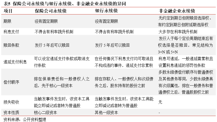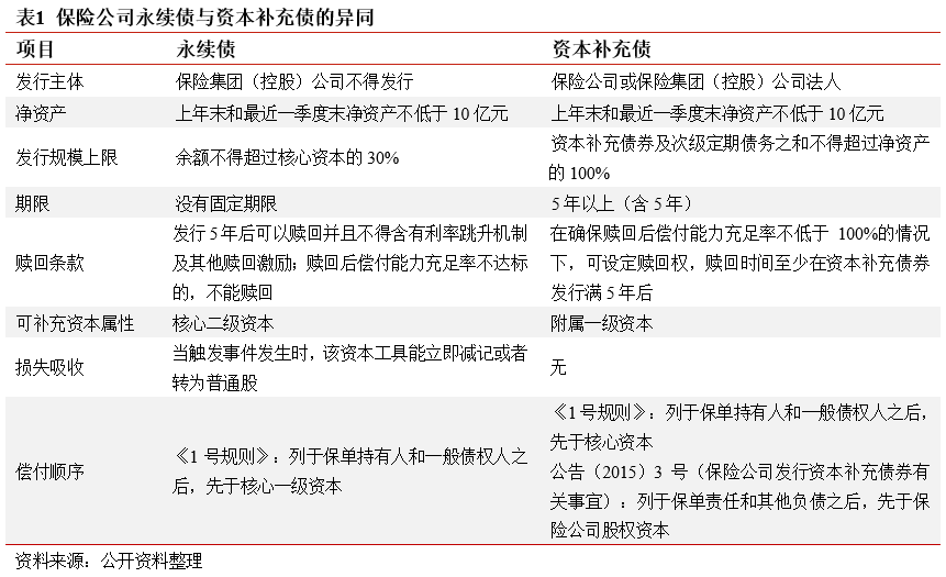 從發(fā)行主體來看,《征求意見稿》規(guī)定了保險(xiǎn)集團(tuán)(控股)公司不得發(fā)行永續(xù)債。從期限來看,永續(xù)債無固定到期期限,在償付能力充足率達(dá)標(biāo)的情況下,發(fā)行人能在發(fā)行5年后主動(dòng)選擇是否贖回永續(xù)債,較固定期限的資本補(bǔ)充債而言,穩(wěn)定性更好。從資本屬性來看,資本補(bǔ)充債用于補(bǔ)充附屬一級(jí)資本,僅有助于提高綜合償付能力充足率,而發(fā)行永續(xù)債可以補(bǔ)充核心二級(jí)資本,能同時(shí)提高核心償付能力充足率和綜合償付能力充足率。尤其重要的是,保險(xiǎn)公司永續(xù)債包含損失吸收條款,當(dāng)觸發(fā)事件發(fā)生時(shí),將進(jìn)行減記或轉(zhuǎn)股,有助于增強(qiáng)保險(xiǎn)公司在持續(xù)經(jīng)營(yíng)期間的損失吸收能力。從償付順序來看,根據(jù)《保險(xiǎn)公司償付能力監(jiān)管規(guī)則第1號(hào):實(shí)際資本》(以下簡(jiǎn)稱“《1號(hào)規(guī)則》”)的要求,核心二級(jí)資本的受償順序列于保單持有人和一般債權(quán)人之后、先于核心一級(jí)資本,附屬一級(jí)資本的受償順序列于保單持有人和一般債權(quán)人之后、先于核心資本。