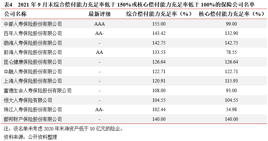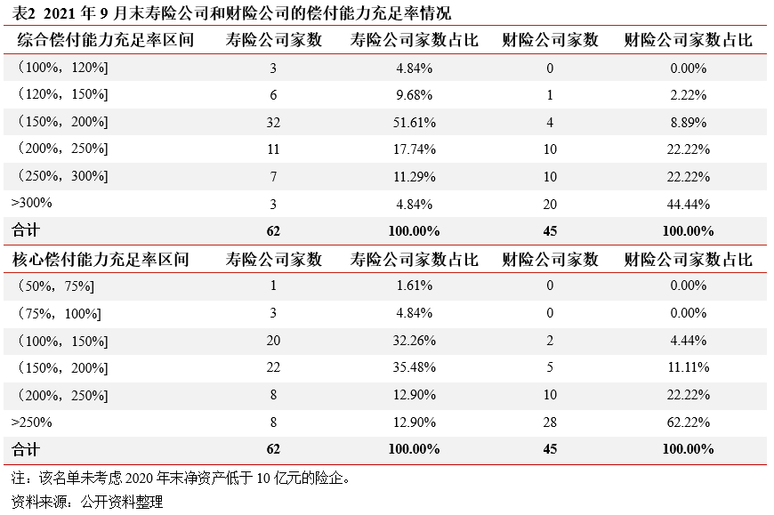 受償二代二期工程落地、壽險(xiǎn)行業(yè)轉(zhuǎn)型及車險(xiǎn)綜合改革影響,短期內(nèi)保險(xiǎn)公司償付能力充足率面臨下降壓力,其中壽險(xiǎn)公司的下降壓力更大,補(bǔ)充資本動(dòng)力更強(qiáng)。受壽險(xiǎn)產(chǎn)品結(jié)構(gòu)和代理人渠道轉(zhuǎn)型、車險(xiǎn)綜合改革等影響,保險(xiǎn)公司保費(fèi)增速承壓,疊加償二代二期工程對(duì)險(xiǎn)企資本認(rèn)定趨嚴(yán),短期內(nèi)保險(xiǎn)公司償付能力充足率有一定的下降壓力。償二代二期工程規(guī)定原計(jì)入核心一級(jí)資本的保單未來盈余將分別計(jì)入核心一級(jí)資本、核心二級(jí)資本、附屬一級(jí)資本和附屬二級(jí)資本,壽險(xiǎn)公司的核心償付能力充足率的下降幅度或?qū)⒋笥诰C合償付能力充足率,具有更為迫切的永續(xù)債發(fā)行需求。截至2021年9月末,最近一年末凈資產(chǎn)不低于10億元的壽險(xiǎn)公司和財(cái)險(xiǎn)公司償付能力充足率情況見下表,整體來看,財(cái)險(xiǎn)公司的償付能力充足率水平要高于壽險(xiǎn)公司。