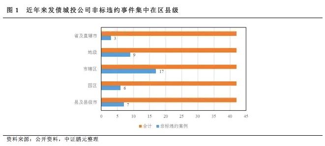 事實(shí)上,縣級(jí)城投公司確實(shí)通過(guò)融資租賃、信托等開展了較多的非標(biāo)融資,不僅融資成本高企,而且還存在“短借長(zhǎng)用”帶來(lái)的期限錯(cuò)配風(fēng)險(xiǎn)。疊加非標(biāo)融資的私募屬性,很多縣級(jí)城投公司在償債資金不足的情況下都傾向于對(duì)非標(biāo)融資進(jìn)行選擇性違約,這就導(dǎo)致縣級(jí)城投公司的非標(biāo)頻頻“爆雷”。據(jù)不完全統(tǒng)計(jì),從2018年非標(biāo)監(jiān)管趨嚴(yán)至2020年末,市場(chǎng)上共計(jì)發(fā)生90余起城投公司(含未發(fā)債城投公司)非標(biāo)違約事件,其中區(qū)縣級(jí)(含園區(qū))城投公司發(fā)生非標(biāo)違約的次數(shù)占比接近80%(縣及縣級(jí)市、園區(qū)、市轄區(qū)占比分別為48.72%、10.26%、19.66%);共計(jì)發(fā)生40余起發(fā)債城投公司非標(biāo)違約事件,其中區(qū)縣級(jí)(含園區(qū))發(fā)債城投公司發(fā)生非標(biāo)違約的次數(shù)占比超過(guò)70%(見(jiàn)圖1),呈現(xiàn)出明顯的向低行政級(jí)別城投集中的態(tài)勢(shì)。雖然目前非標(biāo)違約尚未對(duì)城投債形成快速傳導(dǎo),但毫無(wú)疑問(wèn)非標(biāo)違約的縣級(jí)城投公司面臨著更大的債務(wù)違約風(fēng)險(xiǎn)。