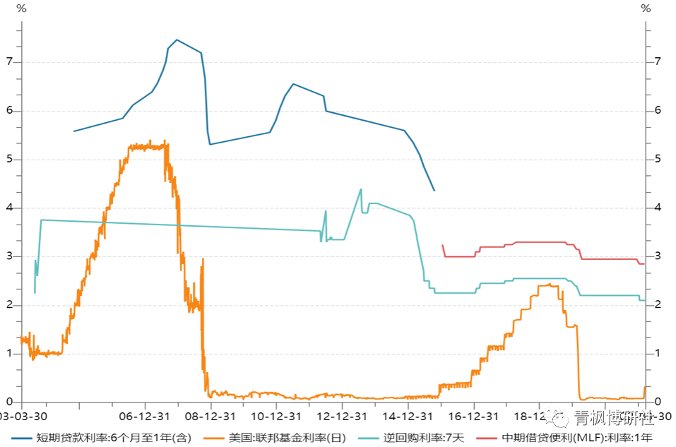 1、美聯(lián)儲政策收緊過程中,中國貨幣政策在政策利率調(diào)整方面,要么選擇觀望,要么跟隨加息,二者在節(jié)奏上雖有差異,但方向上總體保持一致。例如,美聯(lián)儲在2015年12月至2018年12月的三年加息周期里,恰恰也是中國貨幣政策持續(xù)收緊與監(jiān)管政策不斷強化的時期。