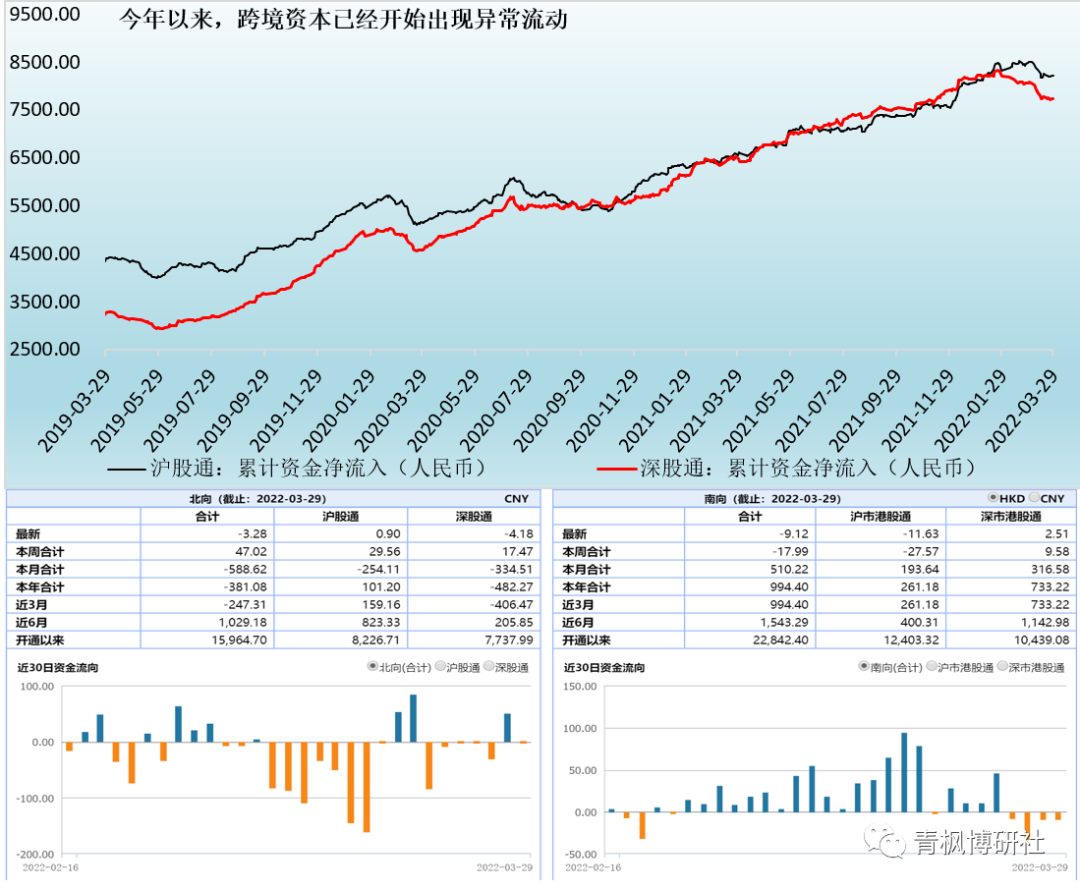 (四)今年以來受美聯(lián)儲等經(jīng)濟體政策收緊以及地緣博弈加劇等因素影響,跨境資本已經(jīng)開始出現(xiàn)異常流動,引起了市場及決策層的警覺,在連續(xù)兩個月的持續(xù)寬松后,制約著貨幣政策的進一步寬松。具體看,今年以來和今年3月以來,北向通資金凈流出規(guī)模分別達到381.08億元和588.62億元,南向通資金凈流入 規(guī)模則分別達994.40億元和510.22億元。