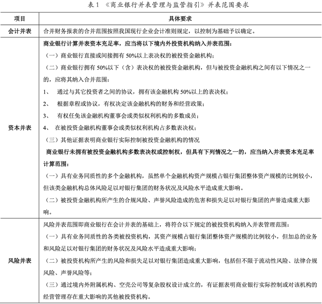 從并表的范圍來看,由于監管目標和會計目標的差異,監管機構會在會計并表的基礎上,充分考慮重大風險因素,按照風險并表的思路拓展資本并表和風險并表的范圍,如聯合論壇認為需“識別和計量所有具有潛在資本需求的重大風險,無論是表內還是表外業務風險”,如歐盟就金融控股公司視具體情況確定了三種并表范圍。我國原銀監會在《商業銀行并表管理與監管指引》中也明確提出了會計并表、資本并表和風險并表的三種并表范圍,具體如下表所示。