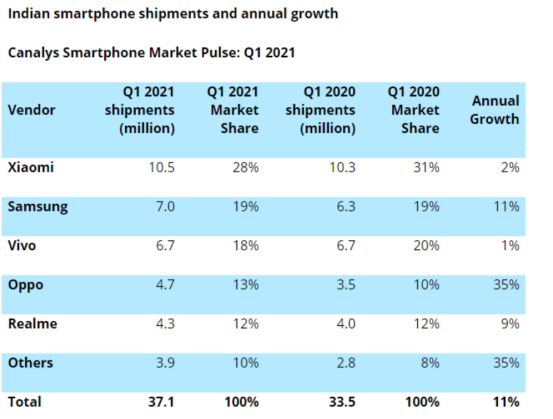 尤其是印度市場,小米延續了之前的強勢地位,連續14個季度維持榜首,并以28%的市場份額穩坐頭把交椅,領先第二名三星9個百分點。
