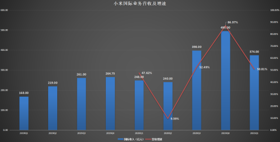 根據2021年Q1財報,小米海外市場單季營收達374億元,同比增長50.6%,占公司總營收的48.6%。