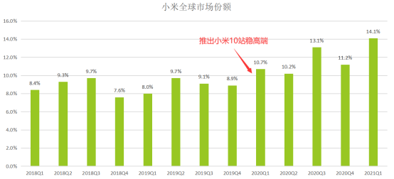 正是穩扎穩打的作風,讓其能夠在突然的疫情之下,依然有余力推出行業內首款5G旗艦機型小米10,從而站穩高端市場。根據IDC數據,在2020Q1季度推出小米10后,小米全球市場份額突然增長,并由此開始不斷鯨吞其他廠家的份額。