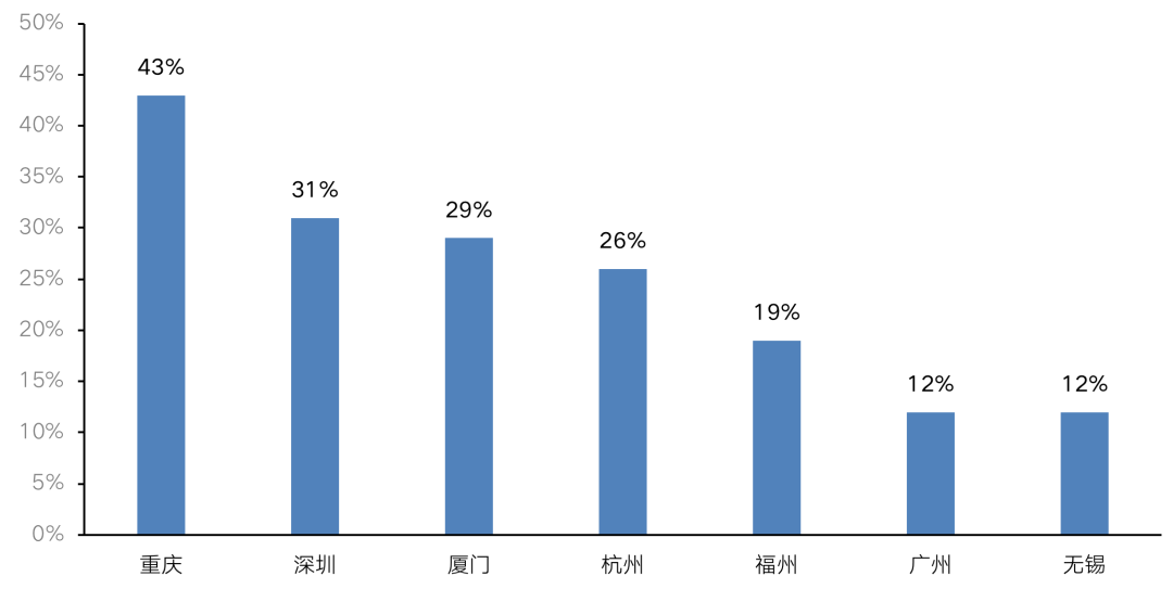 不止杭州,土拍市場越熱的城市,房企一般都要面臨高溢價,或更為嚴苛的競拍規(guī)則,而“溢價”、“自持”、“限價”也成為成交地塊最大的關注點。其中重慶整體溢價率高達43%,主城區(qū)46宗地塊中有31宗溢價率超40%,占比近8成,最高溢價率達到130%。再如北京,由于設置地價上限,競拍地塊轉競公租房、自持等環(huán)節(jié),可售面積減少,拿地成本也隱形抬高。