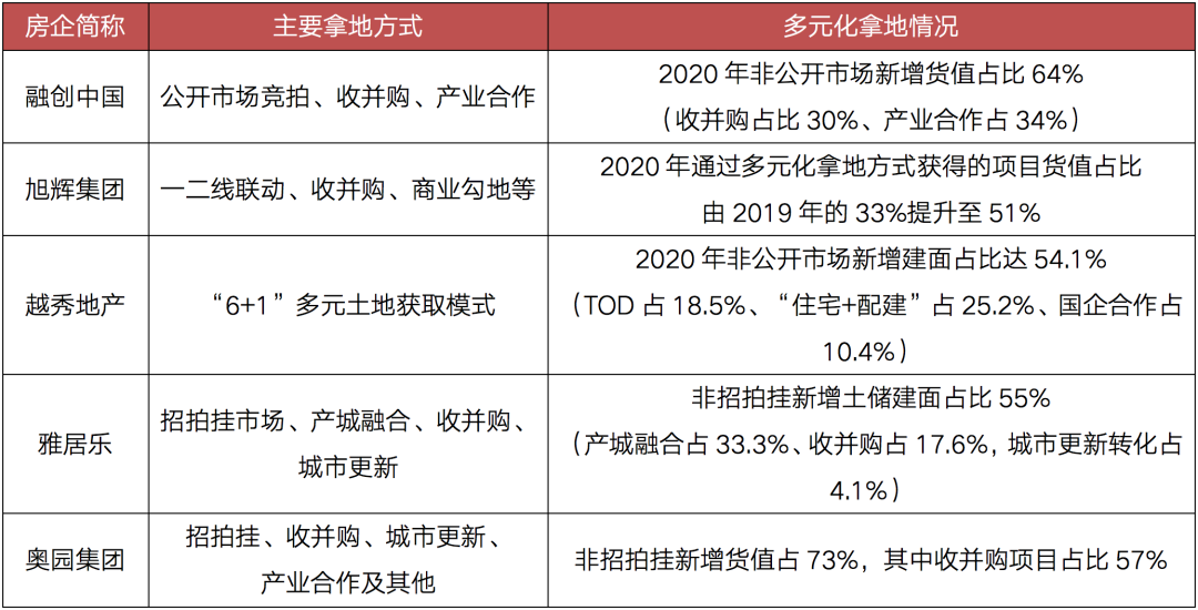 從目前來看,收并購、城市更新、產業(yè)勾地是最為常見的多元化拿地方式,尤其是城市更新,由于成本低、利潤高,已經成為很多企業(yè)業(yè)績增長的新引擎。以旭輝為例,2020年通過一二線聯(lián)動、收并購、商業(yè)勾地等多元化拿地方式獲得的項目貨值占比由2019年的33%提升至51%。此外,越秀通過“6+1”的多元土地獲取模式,包括TOD、城市更新、“住宅+配建”、國企合作、收并購、產業(yè)勾地和公開市場競拍,在2020年新增投資中通過非公開市場獲取的地塊占比達到54.1%。
