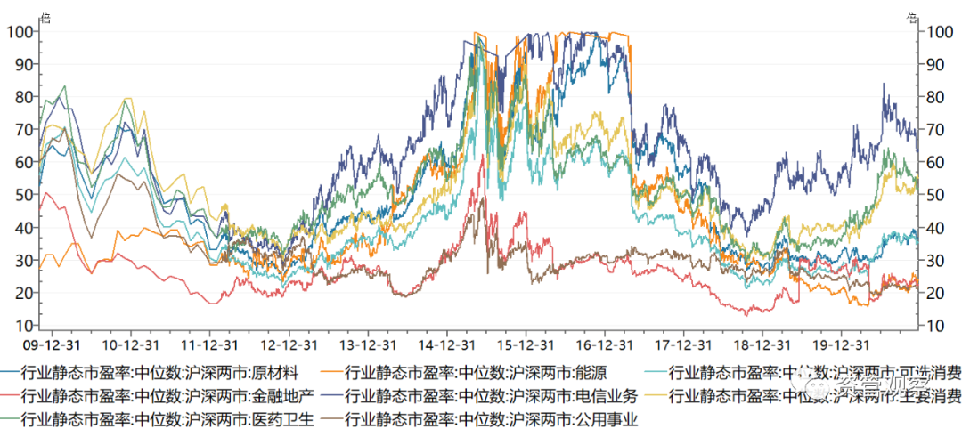 從估值角度看,2020年股市的上漲更多是估值推動,估值已上漲了18%。滬深兩市目前靜態市盈率為20.66倍,已經接近75%分位數,達到較高水平,未來估值大幅上升的空間有限。從各行業估值看,差異化非常明顯,能源、原材料、金融地產、可選消費、公用事業處于相對較低的估值,而電信、醫藥、主要消費則處于較高估值,這些領域的資產也被投資者認為是當前的核心資金,機構資金抱團現象較為突出。從估值角度看,2021年,部分高估值行業需要逐步自我消化,而低估值領域又多屬于周期行業領域,可能迎來估值重新定價的市場趨勢。