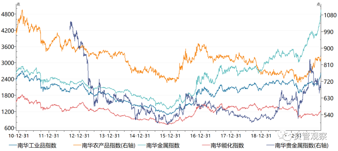 從歷史規律來看,如果比照歷史重大事件后的相似環境,可能只有2010年具有一定參考性,這主要在于2008年爆發的全球危機一致持續至2009年,在全球的努力下才獲得平息,2010年的宏觀金融走勢會與2021年具有很大相似處。一是經濟走勢形態很相似,受到全球金融危機沖擊,2009年一季度經濟增速處于最低點,之后開始復蘇,在2020年一季度達到季度最高點,而2021年受到基數原因也有望達到近幾個季度最高點。二是從政策刺激方面,為應該全球金融危機,我國推出了四萬億經濟刺激政策,央行大幅下調存款準備金率和基準利率,在經濟復蘇后,2010年刺激政策逐步退出,這個政策節奏與今年和明年的走勢也較為相似。三是從通脹看,尤其是PPI方面,這兩個年份都是在前一年受到需求沖擊后,2010年實現了PPI的大幅度增長,當前PPI已經出現向上拐點,明年PPI有望持續走高。當然,越需要看到兩個年份有所差距在于,所處經濟周期以及政策實施形式都有一定差異之處,但是這可能只影響金融市場波動幅度,對于金融市場方向仍可有很高的參考性。那么2010年,大宗商品表現最好,南華綜合指數收益率為12.04%,債券總指數收益率為1.92%,而萬得全A指數收益率為-6.88%,整體來看風險資產內部表現出現了較為明顯的分化。