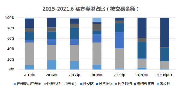 而內資基金在2016~2017年表現搶眼,但在2019年后部分機構逐步退出市場。2020年,國企及金融機構(銀行、保險等)購置成交量明顯上升。2021年上半年投資型買家活躍。