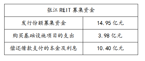 以張江REIT為例,光大安石作為雙權益人之一,在資金投向上,一是購買光全投資持有的安恬投資100%股權,預計支付金額約為3.98億元;二是分別向安恬投資及中京電子發放借款,償還存量負債及其他用途,合計約為10.4億元。