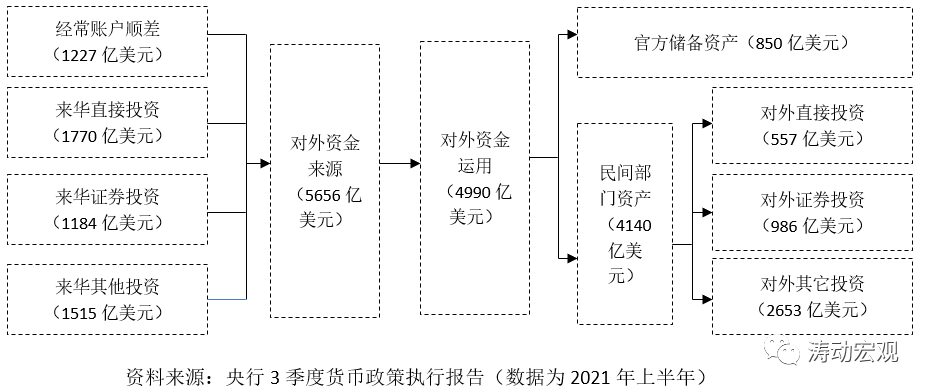 第一,央行在銀行間外匯市場中收購外匯所形成的人民幣投放,反映在央行資產負債表中,形成央行所持有的外匯儲備。