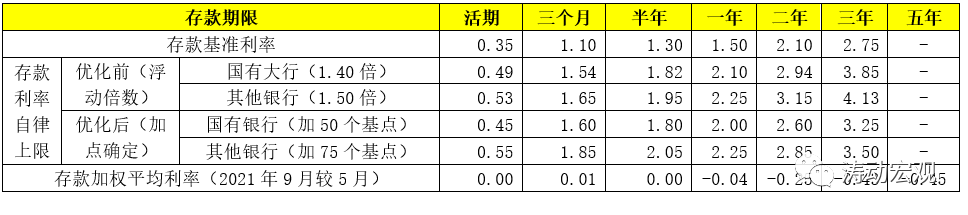 2021年6月21日,市場利率定價自律機制將存款利率上限由存款基準利率浮動倍數調整為加點確定(詳情參見存款利率報價方式調整全解),目前為止已施行5個月左右。具體看,2年期及以上的長期定期存款利率明顯下降,9月新發生定期存款加權平均利率為2.21%、同比下降17BP、較今年5月下降28BP。其中,2年期、3年期和5年期定期存款利率較5月份分別下降25BP、43BP和45BP。