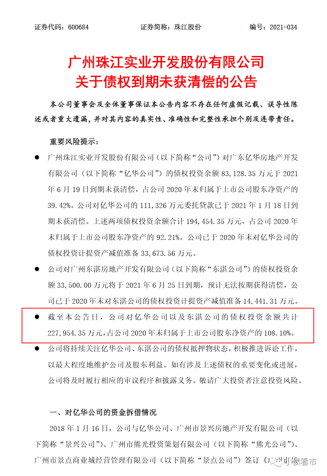 6月22日,珠江股份(600684.SH)公告稱,其對(duì)億華公司債權(quán)投資余額8.3億元于2021年6月19日到期后未獲清償。