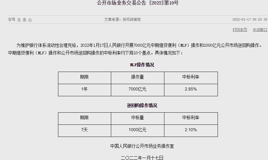 2022年1月17日,央行7000億元1年期MLF(中期借貸便利)操作,利率2.85%,此前為2.95%;同日進行1000億元7天期逆回購操作,中標(biāo)利率2.1%,從原來的2.2%下調(diào)10個基點。