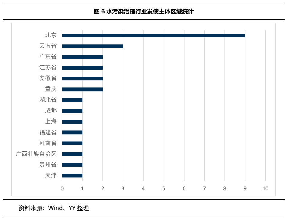 從區位來看,水污染治理行業的發債主體主要集中在北京(32.14%),其次是云南?。?0.71%),重慶、安徽、江蘇和廣東緊接其后,分別占比7.14%。從主體性質看,國有企業最多20家(71.43%),其中地方國有企業16家,另外民營企業6家(21.43%)。28家水污染治理公司中共19家為上市公司,整體看水污染治理行業行業資源整合能力較強
