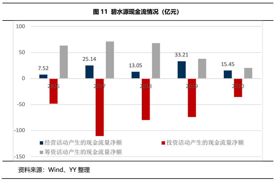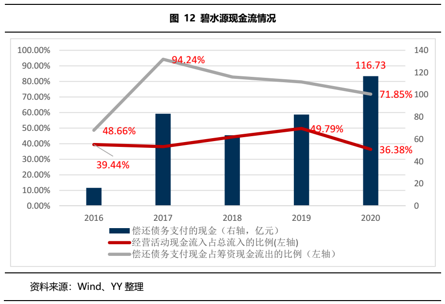 截至2020年末,經營性現金流經凈額為15.45億元,同比下降53.48%,經營性現金流流入占總流入的比例為僅為36.38%。公司雖已將發展重心由重資產項目轉移到輕資產項目上,投資活動現金流缺口在減少,但前期重資產模式的激進擴張導致償還債務支付的現金在不斷增加,2018年到2020年償還債務支付的現金占籌資活動現金流流出比例分別為82.86%、79.66%、71.85%。