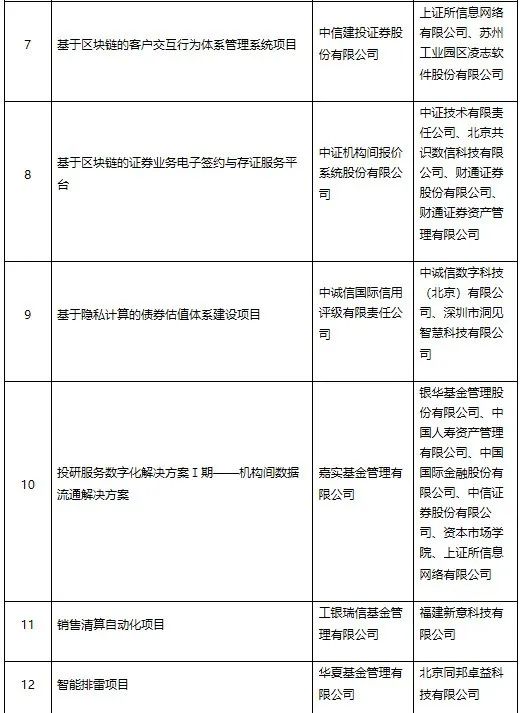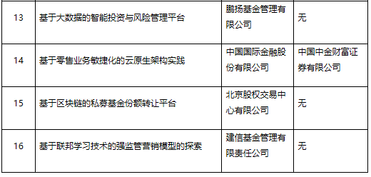 公告顯示,為推動證券期貨行業(yè)金融科技穩(wěn)妥發(fā)展,促進(jìn)資本市場數(shù)字化轉(zhuǎn)型,完善資本市場金融科技監(jiān)管機(jī)制,2021年3月,中國證監(jiān)會在北京地區(qū)率先啟動資本市場金融科技創(chuàng)新試點(diǎn)工作。根據(jù)中國證監(jiān)會有關(guān)工作要求,資本市場金融科技創(chuàng)新試點(diǎn)(北京)專項(xiàng)工作組已完成第一批試點(diǎn)項(xiàng)目的征集遴選、專家評審、專業(yè)評估、社會公示等工作,現(xiàn)對16個(gè)試點(diǎn)項(xiàng)目啟動試點(diǎn)予以公告。