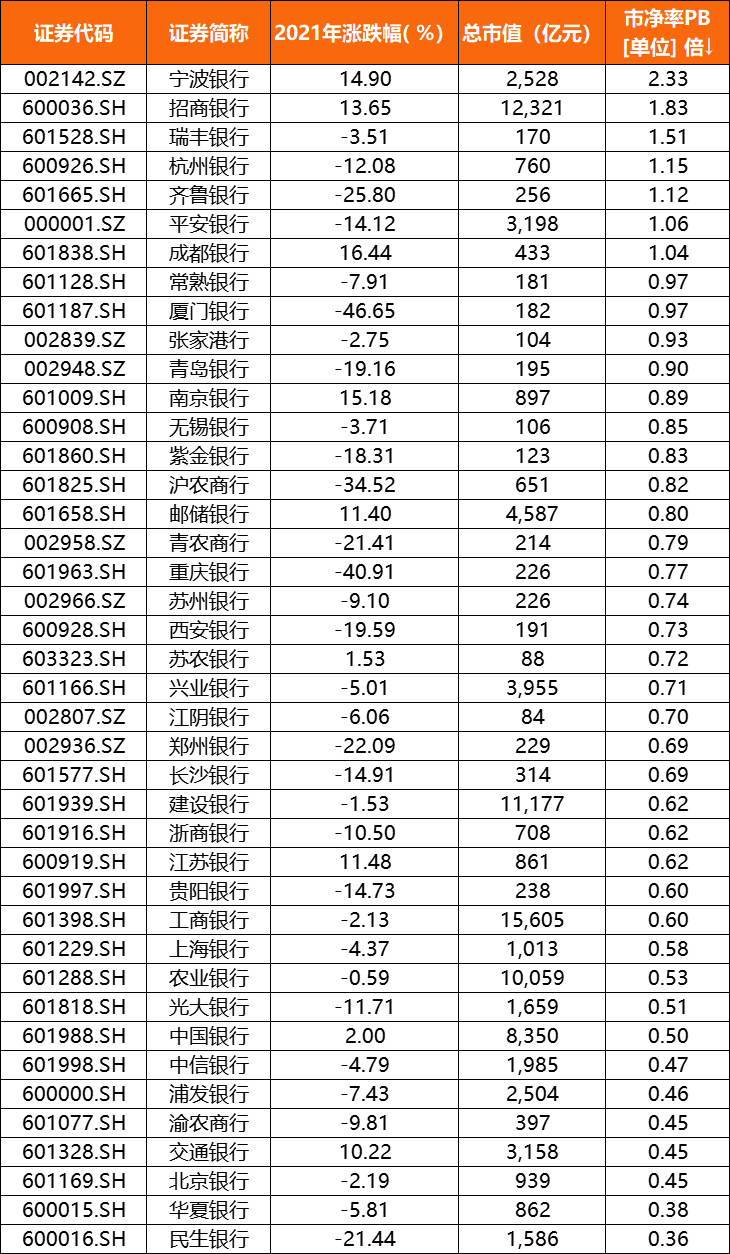 個(gè)股方面,2021年超過七成銀行股股價(jià)下跌,其中重慶銀行(601963.SH)、廈門銀行(601187.SH)股價(jià)2021年跌幅超過40%;在41家A股上市銀行中,僅有7家銀行的PB(市凈率)在1以上,其余34家銀行的PB均在1以下;同時(shí),超過六成銀行股價(jià)跌破發(fā)行價(jià)。