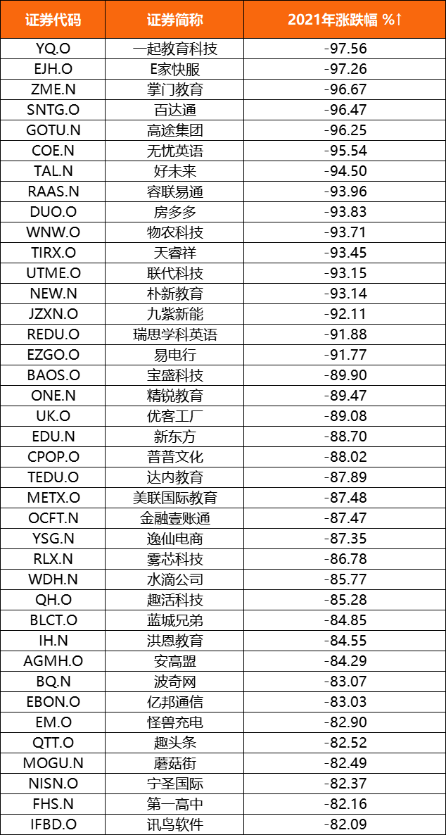 據(jù)Wind數(shù)據(jù),2021年在美上市的281家中國概念股中,有226家股價(jià)呈現(xiàn)下跌狀態(tài),跌幅超50%以上的個(gè)股有134家,跌幅超30%以上的達(dá)185家。具體來看,百度(BIDU.O)2021年下跌31%,老虎證券(TIGR.O)下跌38%,嗶哩嗶哩(BILI.O)下跌46%,阿里巴巴(BABA.N)下跌49%,陸金所控股(LU.N)下跌超60%,拼多多(PDD.O)下跌超過67%,慧擇(HUIZ.O)下跌超過79%,金融壹賬通(OCFT.N)下跌超過87%。