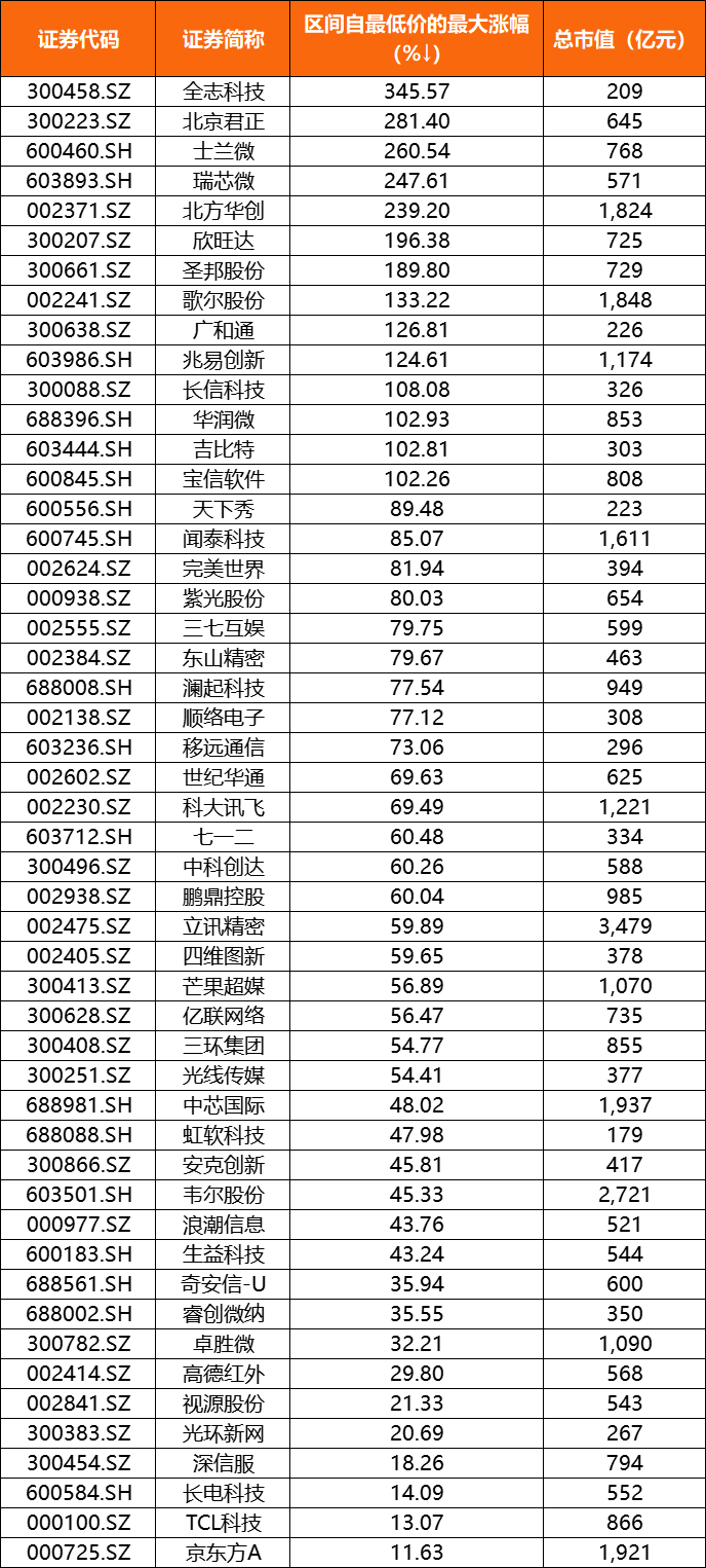 注:1、區(qū)間自最低價(jià)的最大漲幅、區(qū)間換手率的計(jì)算區(qū)間為2021年1月1日-2021年12月31日;
