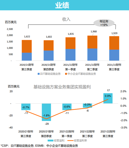 分業務來看,全球數據中心業務份額連續8個季度實現增長,云IT基礎設施營業額年同比增長38%,企業IT基礎設施業務年同比增長7%。