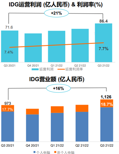 第三財季,IDG實現收入1126億人民幣,同比增長16%;實現運營利潤86.4億人民幣,同比增長21%。