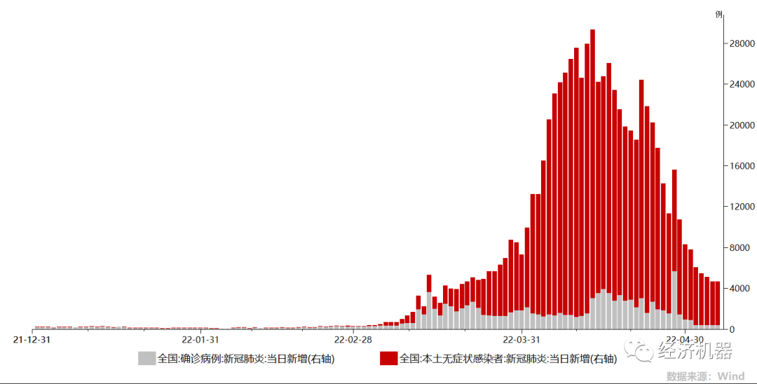 疫情防控:這波高峰已過,正在邊際好轉。我國每日新增確診人數和無癥狀感染人數從高峰期的接近3萬人,降至目前4000人左右(圖1),基本得到控制。隨著后續核酸檢測常態化,或會找到一條動態清零與經濟的共存之路。
