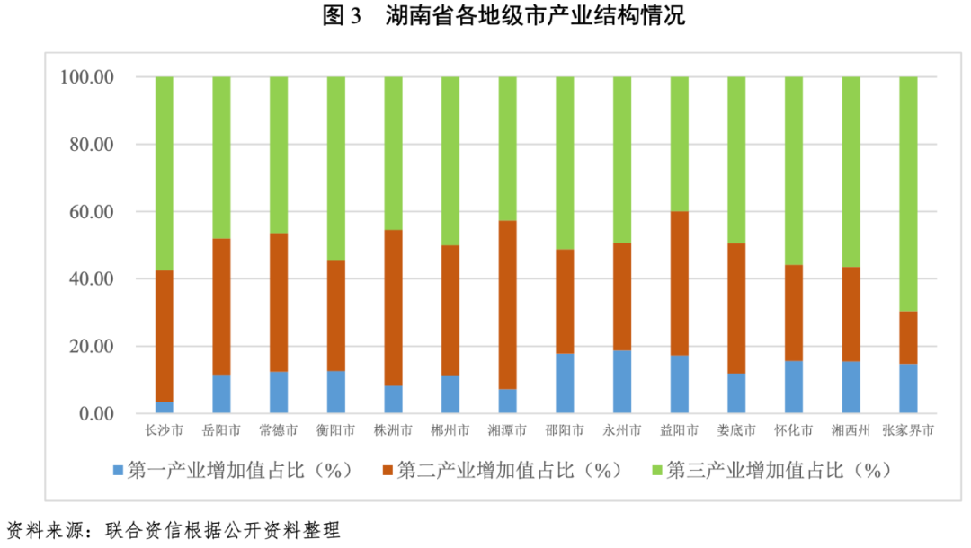 湖南省長株潭地區、湘南地區、湘北地區和湘西地區經濟實力分化程度較高,長株潭地區經濟實力明顯高于其他地區,湘西地區經濟實力較弱;長沙市作為湖南省省會城市,經濟實力及增速均處于全省領先地位,為全省唯一GDP規模超萬億的地級市。