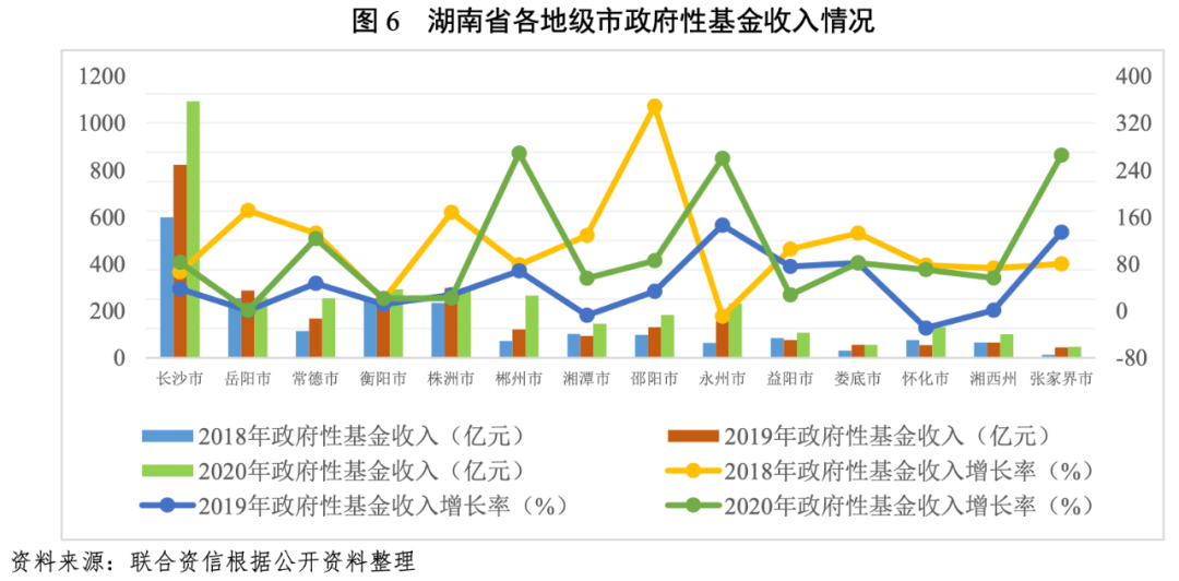 政府性基金收入方面,長沙市的政府性基金收入規模位于全省首位,達到1093.41億元,占湖南省政府性基金收入的32.24%;岳陽市、常德市、衡陽市、株洲市、郴州市及永州市政府性基金收入規模在200~300億元之間,邵陽市、懷化市、益陽市和湘西州政府性基金收入規模在100~200億元之間,其他地級市政府性基金收入規模較小,不足100億元。2020年,各地級市政府性基金收入均呈現不同程度的增長,其中常德市、郴州市、永州市和張家界市增幅很大,均超過120%。