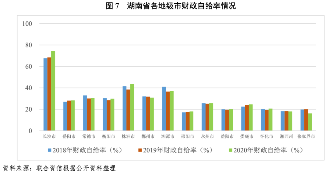 財政自給率方面,2020年除長沙市財政自給率為74.32%外,其他各地級市財政自給率均未超過45%,其中湘西州、邵陽市及張家界市財政自給率最低,均未超過20%。2020年,除郴州市和湘西州財政自給率有所下降外,其他地級市財政自給率均呈現一定的增長。總體看,長沙市財政自給能力較強,其他各地級市財政自給能力弱。